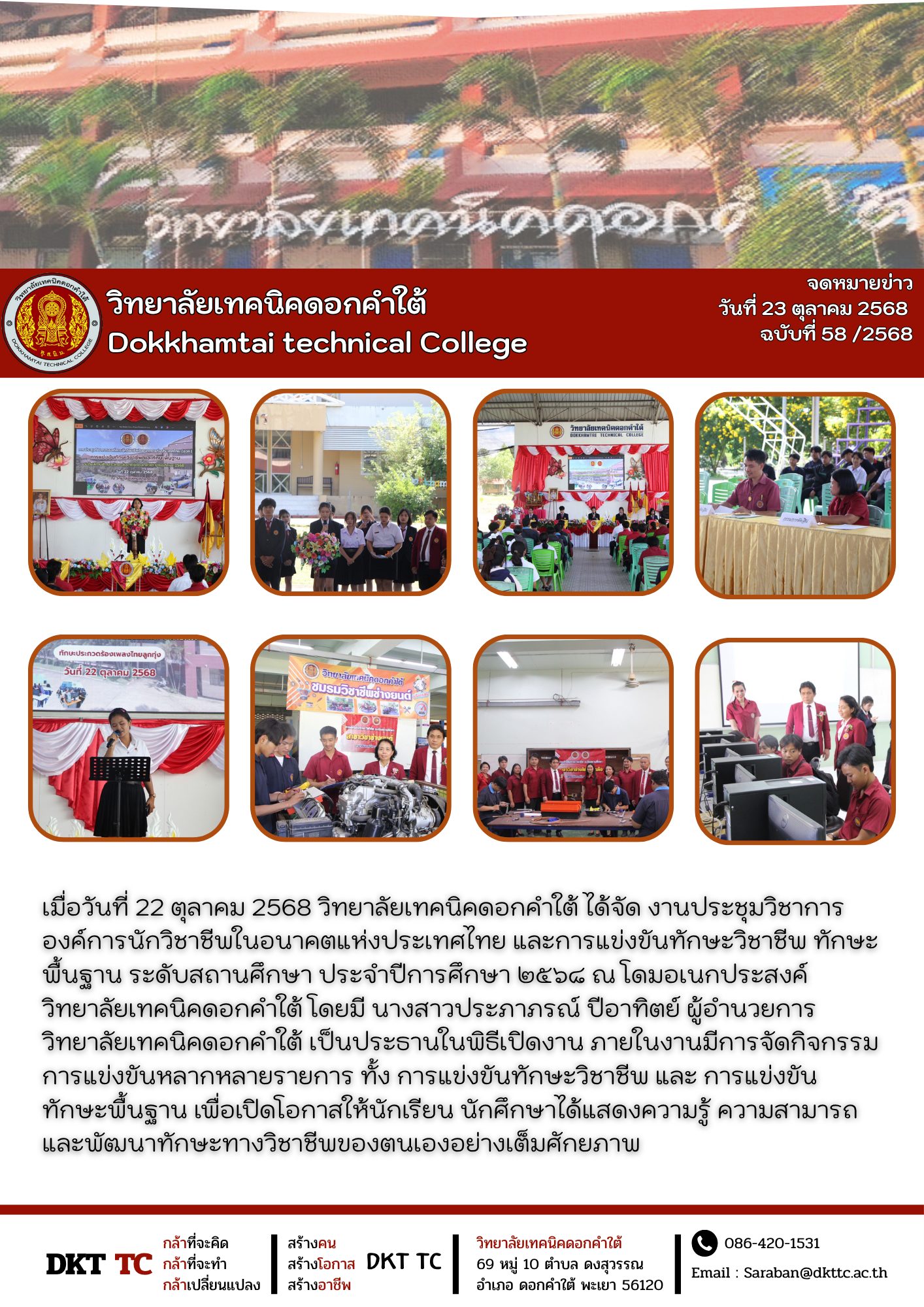 เมื่อวันที่ 22 ตุลาคม 2568 วิทยาลัยเทคนิคดอกคำใต้ ได้จัด งานประชุมวิชาการองค์การนักวิชาชีพในอนาคตแห่งประเทศไทย และการแข่งขันทักษะวิชาชีพ ทักษะพื้นฐาน ระดับสถานศึกษา ประจำปีการศึกษา ๒๕๖๘ ณ อาคารอเนกประสงค์ วิทยาลัยเทคนิคดอกคำใต้ โดยมี นางสาวประภาภรณ์ ปีอาทิตย์ ผู้อำนวยการวิทยาลัยเทคนิคดอกคำใต้ เป็นประธานในพิธีเปิดงาน ภายในงานมีการจัดกิจกรรมการแข่งขันหลากหลายรายการ ทั้ง การแข่งขันทักษะวิชาชีพ และ การแข่งขันทักษะพื้นฐาน เพื่อเปิดโอกาสให้นักเรียน นักศึกษาได้แสดงความรู้ ความสามารถ และพัฒนาทักษะทางวิชาชีพของตนเองอย่างเต็มศักยภาพ