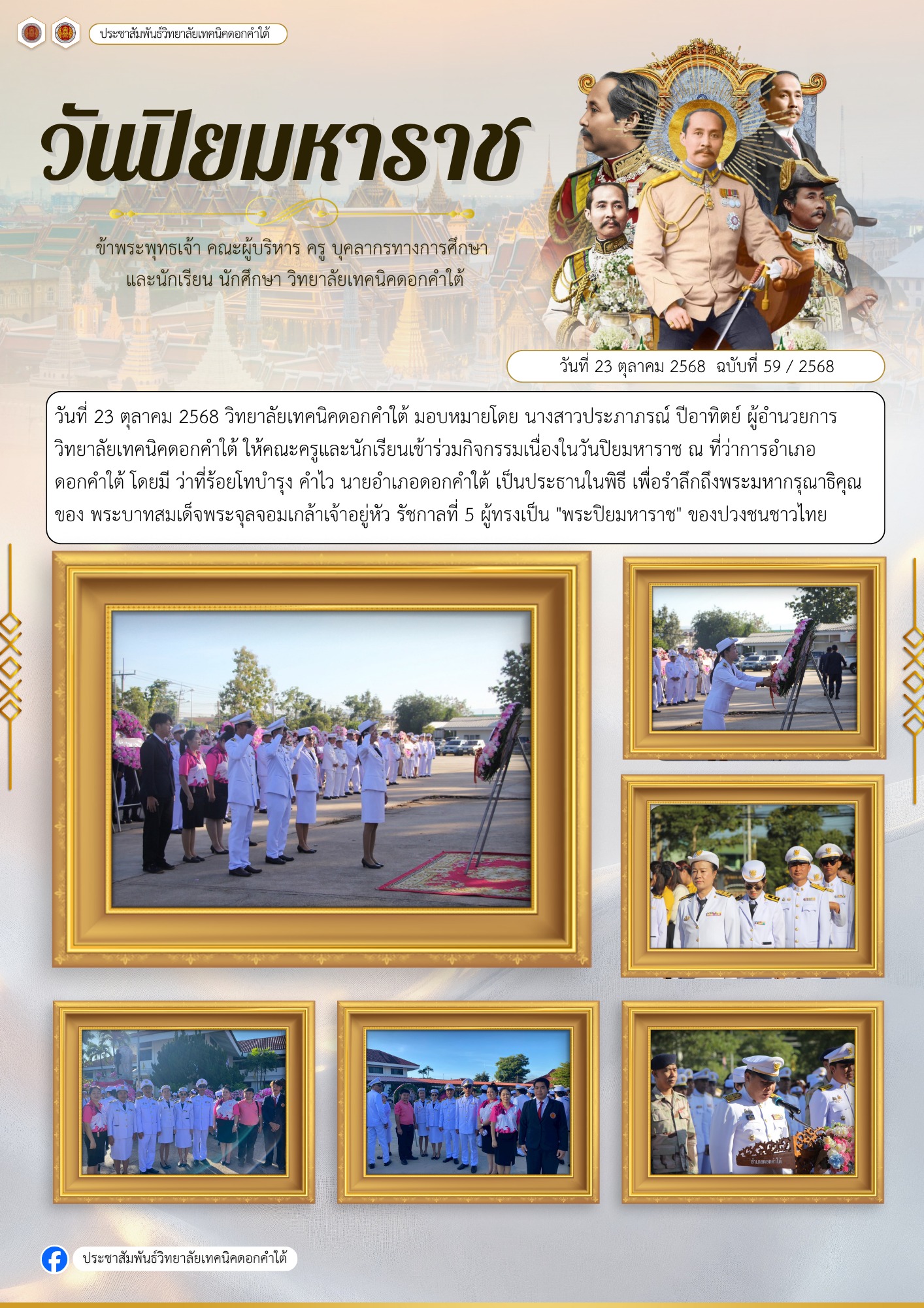 วันที่ 23 ตุลาคม 2568 วิทยาลัยเทคนิคดอกคำใต้ มอบหมายโดย นางสาวประภาภรณ์ ปีอาทิตย์ ผู้อำนวยการวิทยาลัยเทคนิคดอกคำใต้ ให้คณะครูและนักเรียนเข้าร่วมกิจกรรมเนื่องในวันปิยมหาราช ณ ที่ว่าการอำเภอดอกคำใต้ โดยมี ว่าที่ร้อยโทบำรุง คำไว นายอำเภอดอกคำใต้ เป็นประธานในพิธี เพื่อรำลึกถึงพระมหากรุณาธิคุณของ พระบาทสมเด็จพระจุลจอมเกล้าเจ้าอยู่หัว รัชกาลที่ 5 ผู้ทรงเป็น 'พระปิยมหาราช' ของปวงชนชาวไทย