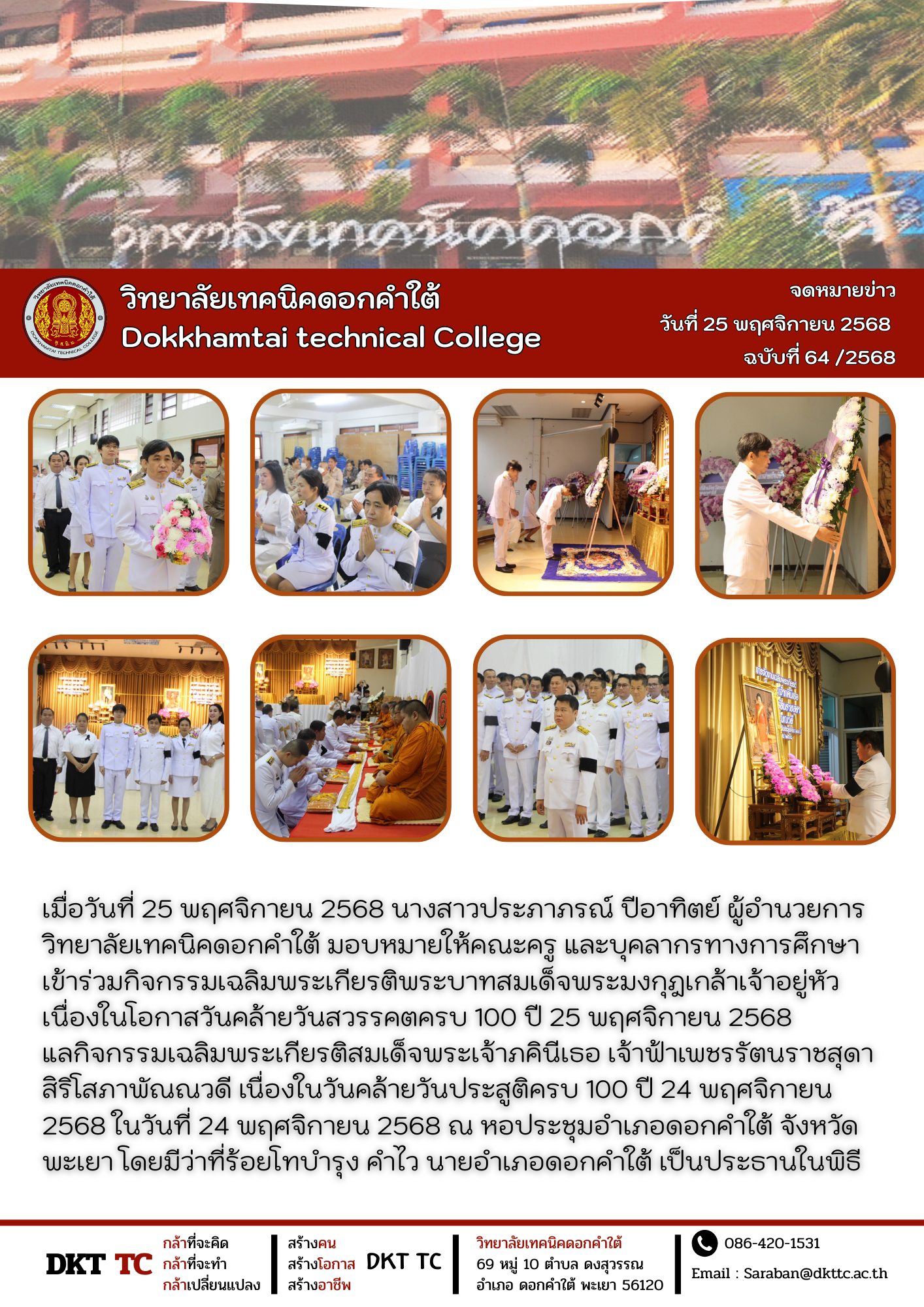 เมื่อวันที่ 24 พฤศจิกายน 2568 นางสาวประภาภรณ์ ปีอาทิตย์ ผู้อำนวยการวิทยาลัยเทคนิคดอกคำใต้ มอบหมายให้คณะครู และบุคลากรทางการศึกษา เข้าร่วมกิจกรรมเฉลิมพระเกียรติพระบาทสมเด็จพระมงกุฎเกล้าเจ้าอยู่หัว เนื่องในโอกาสวันคล้ายวันสวรรคตครบ 100 ปี 25 พฤศจิกายน 2568 แลกิจกรรมเฉลิมพระเกียรติสมเด็จพระเจ้าภคินีเธอ เจ้าฟ้าเพชรรัตนราชสุดา สิริโสภาพัณณวดี เนื่องในวันคล้ายวันประสูติครบ 100 ปี 24 พฤศจิกายน 2568 ในวันที่ 24 พฤศจิกายน 2568 ณ หอประชุมอำเภอดอกคำใต้ จังหวัดพะเยา โดยมีว่าที่ร้อยโทบำรุง คำไว นายอำเภอดอกคำใต้ เป็นประธานในพิธี
