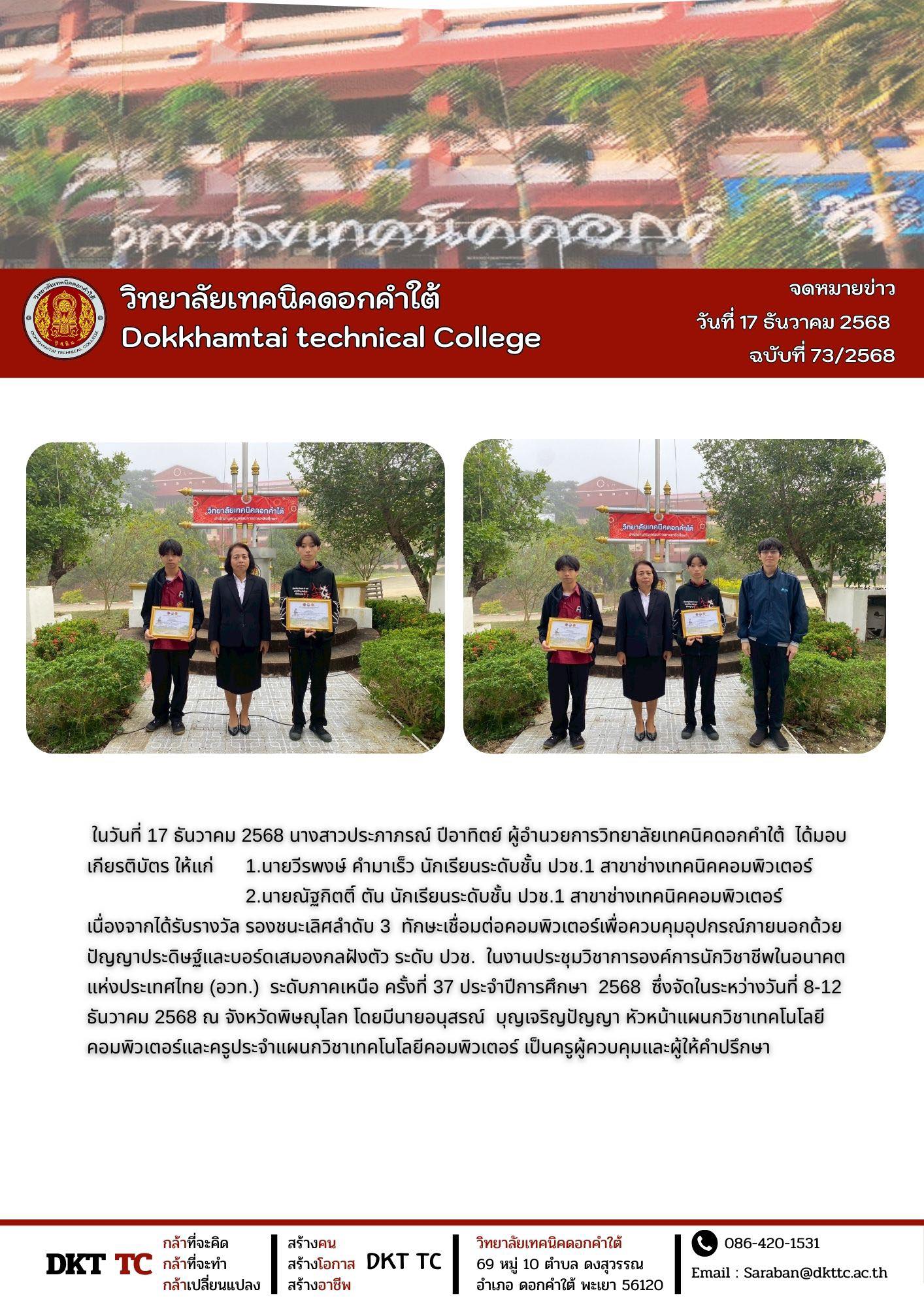 ในวันที่ 17 ธันวาคม 2568 นางสาวประภาภรณ์ ปีอาทิตย์ ผู้อำนวยการวิทยาลัยเทคนิคดอกคำใต้ ได้มอบเกียรติบัตร ให้แก่ 1.นายวีรพงษ์ คำมาเร็ว 2.นายณัฐกิตติ์ ตัน นักเรียนระดับชั้น ปวช.1 สาขาช่างเทคนิคคอมพิวเตอร์ แผนกวิชาเทคโนโลยีคอมพิวเตอร์ เนื่องจากได้รับรางวัล รองชนะเลิศลำดับ 3 ทักษะเชื่อมต่อคอมพิวเตอร์เพื่อควบคุมอุปกรณ์ภายนอกด้วยปัญญาประดิษฐ์และบอร์ดเสมองกลฝังตัว ระดับ ปวช. ในงานประชุมวิชาการองค์การนักวิชาชีพในอนาคตแห่งประเทศไทย (อวท.) ระดับภาคเหนือ ครั้งที่ 37 ประจำปีการศึกษา 2568 ซึ่งจัดในระหว่างวันที่ 8-12 ธันวาคม 2568 ณ จังหวัดพิษณุโลก โดยมีนายอนุสรณ์ บุญเจริญปัญญา หัวหน้าแผนกวิชาเทคโนโลยีคอมพิวเตอร์และครูประจำแผนกวิชาเทคโนโลยีคอมพิวเตอร์ เป็นครูผู้ควบคุมและผู้ให้คำปรึกษา