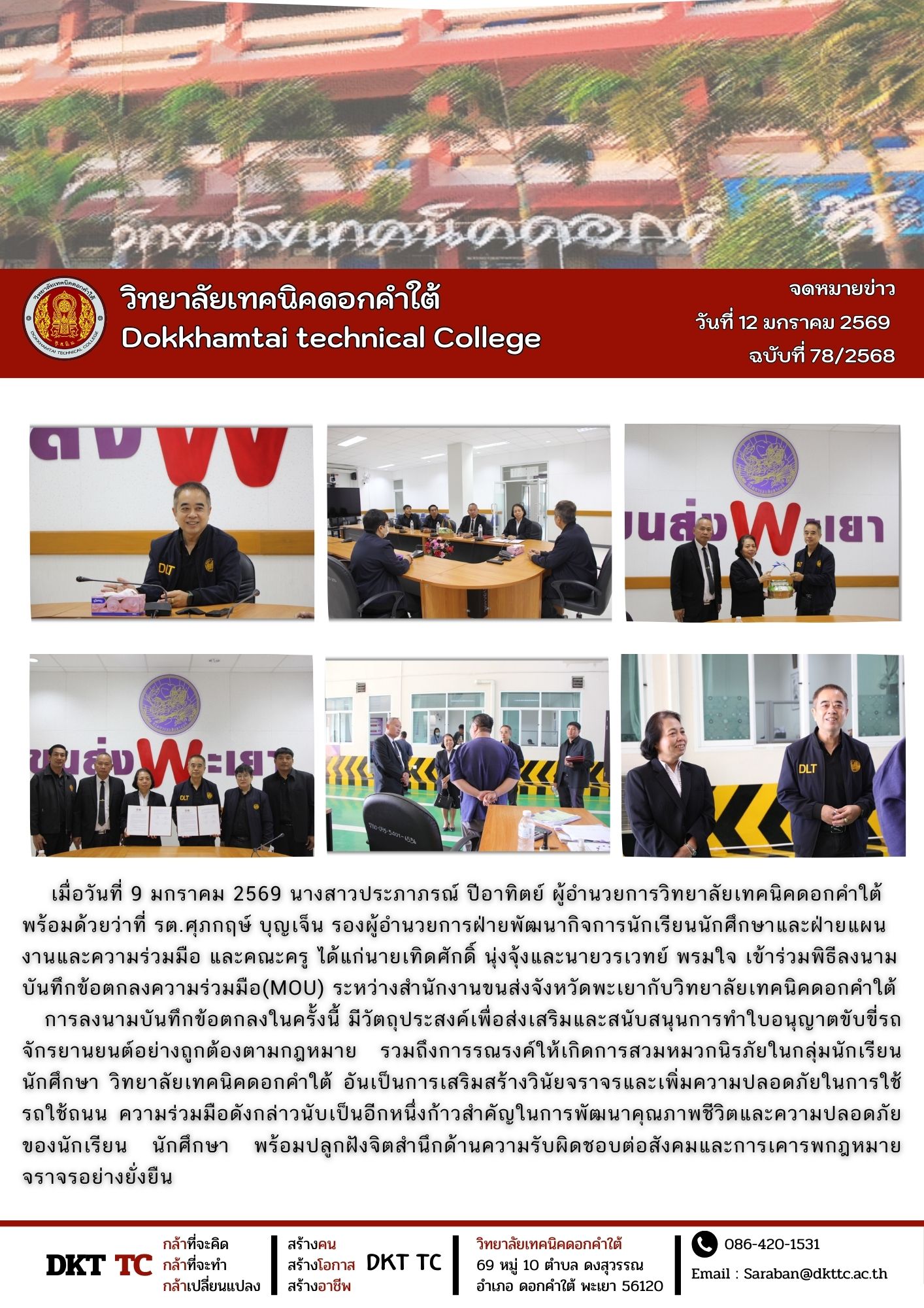 เมื่อวันที่ 9 มกราคม 2569 นางสาวประภาภรณ์ ปีอาทิตย์ ผู้อำนวยการวิทยาลัยเทคนิคดอกคำใต้ พร้อมด้วยว่าที่ รต.ศุภกฤษ์ บุญเจ็น รองผู้อำนวยการฝ่ายพัฒนากิจการนักเรียนนักศึกษาและฝ่ายแผนงานและความร่วมมือ และคณะครู ได้แก่นายเทิดศักดิ์ นุ่งจุ้งและนายวรเวทย์ พรมใจ เข้าร่วมพิธีลงนามบันทึกข้อตกลงความร่วมมือ(MOU) ระหว่างสำนักงานขนส่งจังหวัดพะเยากับวิทยาลัยเทคนิคดอกคำใต้ การลงนามบันทึกข้อตกลงในครั้งนี้ มีวัตถุประสงค์เพื่อส่งเสริมและสนับสนุนการทำใบอนุญาตขับขี่รถจักรยานยนต์อย่างถูกต้องตามกฎหมาย รวมถึงการรณรงค์ให้เกิดการสวมหมวกนิรภัยในกลุ่มนักเรียน นักศึกษา วิทยาลัยเทคนิคดอกคำใต้ อันเป็นการเสริมสร้างวินัยจราจรและเพิ่มความปลอดภัยในการใช้รถใช้ถนน ความร่วมมือดังกล่าวนับเป็นอีกหนึ่งก้าวสำคัญในการพัฒนาคุณภาพชีวิตและความปลอดภัยของนักเรียน นักศึกษา พร้อมปลูกฝังจิตสำนึกด้านความรับผิดชอบต่อสังคมและการเคารพกฎหมายจราจรอย่างยั่งยืน