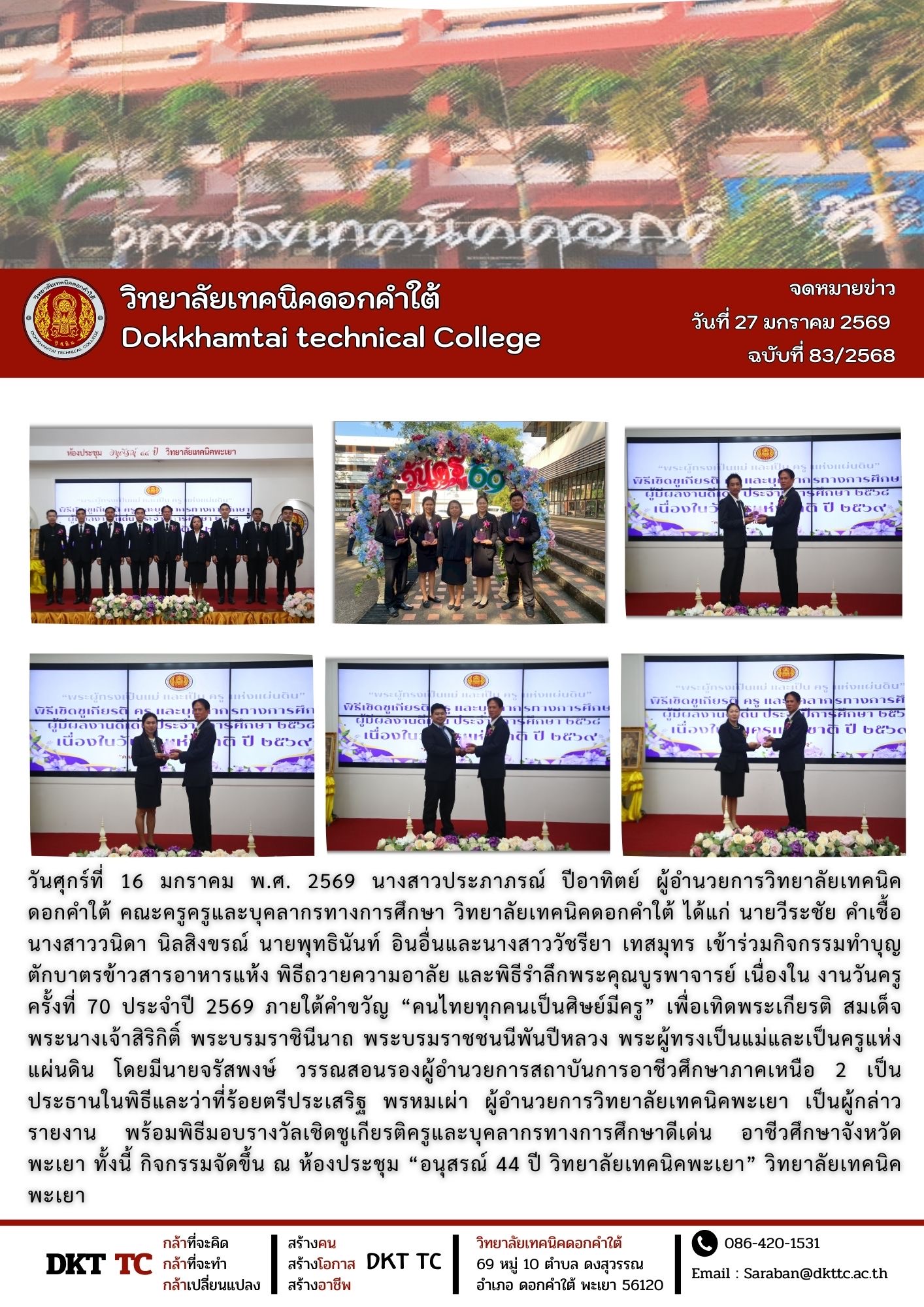 วันศุกร์ที่ 16 มกราคม พ.ศ. 2569 นางสาวประภาภรณ์ ปีอาทิตย์ ผู้อำนวยการวิทยาลัยเทคนิคดอกคำใต้ คณะครูครูและบุคลากรทางการศึกษา วิทยาลัยเทคนิคดอกคำใต้ ได้แก่ นายวีระชัย คำเชื้อ นางสาววนิดา นิลสิงขรณ์ นายพุทธินันท์ อินอื่นและนางสาววัชรียา เทสมุทร เข้าร่วมกิจกรรมทำบุญตักบาตรข้าวสารอาหารแห้ง พิธีถวายความอาลัย และพิธีรำลึกพระคุณบูรพาจารย์ เนื่องใน งานวันครู ครั้งที่ 70 ประจำปี 2569 ภายใต้คำขวัญ คนไทยทุกคนเป็นศิษย์มีครู เพื่อเทิดพระเกียรติ สมเด็จพระนางเจ้าสิริกิติ์ พระบรมราชินีนาถ พระบรมราชชนนีพันปีหลวง พระผู้ทรงเป็นแม่และเป็นครูแห่งแผ่นดิน โดยมีนายจรัสพงษ์ วรรณสอนรองผู้อำนวยการสถาบันการอาชีวศึกษาภาคเหนือ 2 เป็นประธานในพิธีและว่าที่ร้อยตรีประเสริฐ พรหมเผ่า ผู้อำนวยการวิทยาลัยเทคนิคพะเยา เป็นผู้กล่าวรายงาน พร้อมพิธีมอบรางวัลเชิดชูเกียรติครูและบุคลากรทางการศึกษาดีเด่น อาชีวศึกษาจังหวัดพะเยา ทั้งนี้ กิจกรรมจัดขึ้น ณ ห้องประชุม อนุสรณ์ 44 ปี วิทยาลัยเทคนิคพะเยา