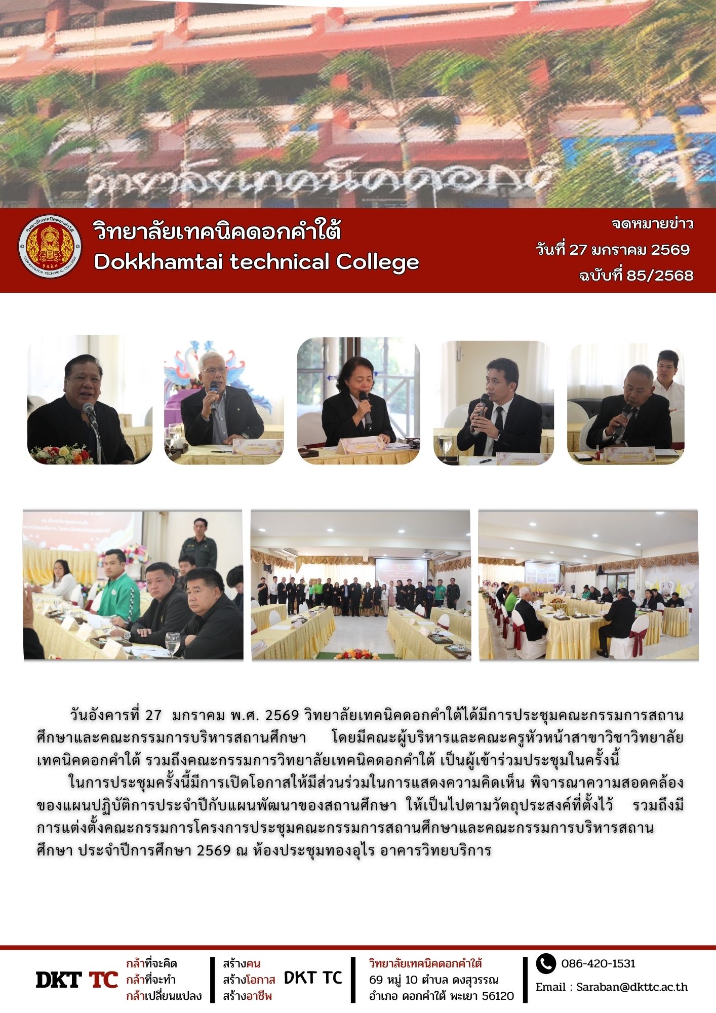 วันอังคารที่ 27 มกราคม พ.ศ. 2569 วิทยาลัยเทคนิคดอกคำใต้ได้มีการประชุมคณะกรรมการสถานศึกษาและคณะกรรมการบริหารสถานศึกษา โดยมีคณะผู้บริหารและคณะครูหัวหน้าสาขาวิชาวิทยาลัยเทคนิคดอกคำใต้ รวมถึงคณะกรรมการวิทยาลัยเทคนิคดอกคำใต้ เป็นผู้เข้าร่วมประชุมในครั้งนี้ ในการประชุมครั้งนี้มีการเปิดโอกาสให้มีส่วนร่วมในการแสดงความคิดเห็น พิจารณาความสอดคล้องของแผนปฏิบัติการประจำปีกับแผนพัฒนาของสถานศึกษา ให้เป็นไปตามวัตถุประสงค์ที่ตั้งไว้ รวมถึงมีการแต่งตั้งคณะกรรมการโครงการประชุมคณะกรรมการสถานศึกษาและคณะกรรมการบริหารสถานศึกษา ประจำปีการศึกษา 2569 ณ ห้องประชุมทองอุไร อาคารวิทยบริการ