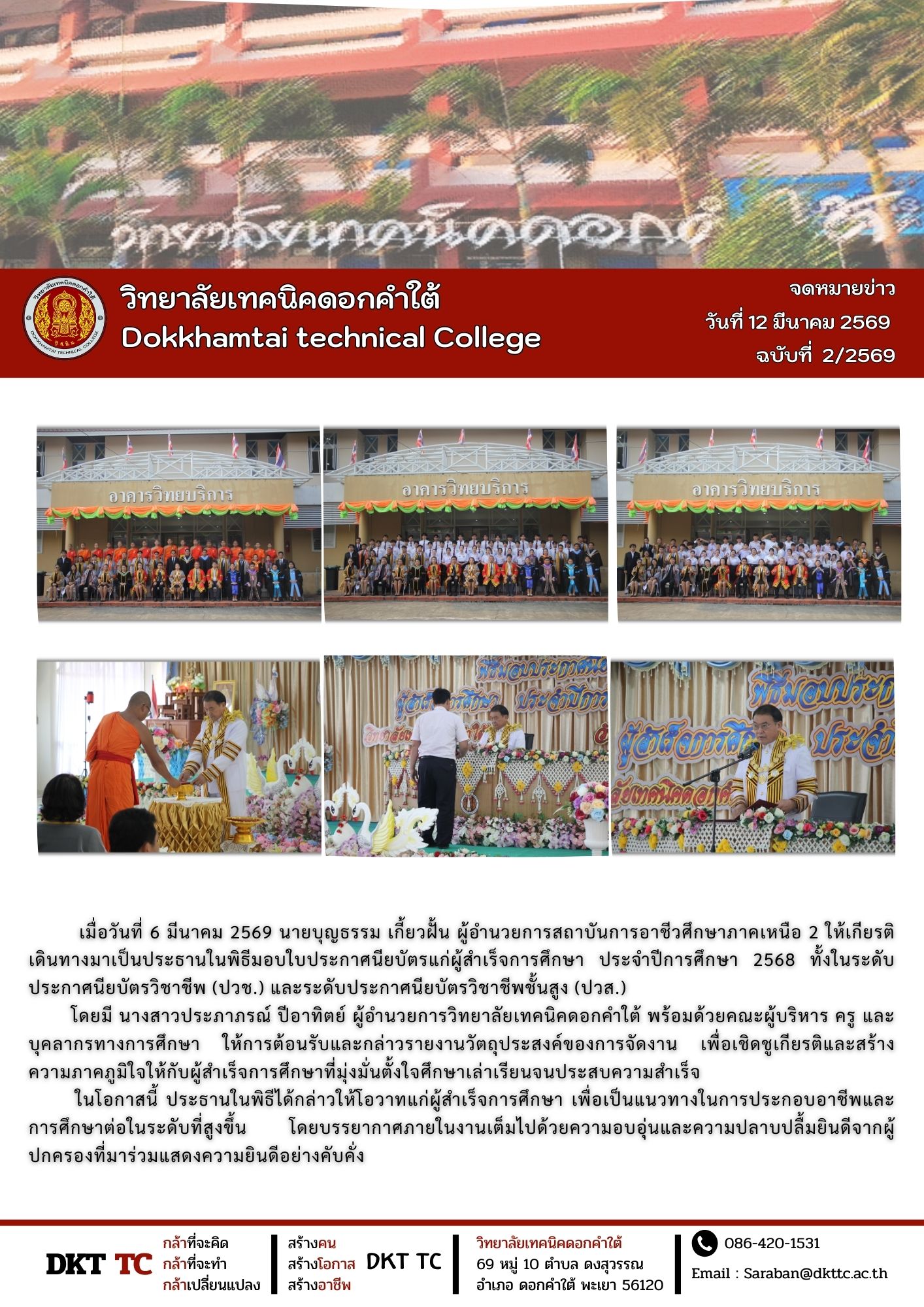 (6 มี.ค. 69) นายบุญธรรม เกี้ยวฝั้น ผู้อำนวยการสถาบันการอาชีวศึกษาภาคเหนือ 2 เป็นประธานในพิธีมอบใบประกาศนียบัตรแก่ผู้สำเร็จการศึกษาในระดับ ปวช. และ ปวส. เพื่อเชิดชูเกียรติและสร้างความภาคภูมิใจให้กับเหล่าศิษย์เก่าที่มุมานะเล่าเรียนจนสำเร็จการศึกษา