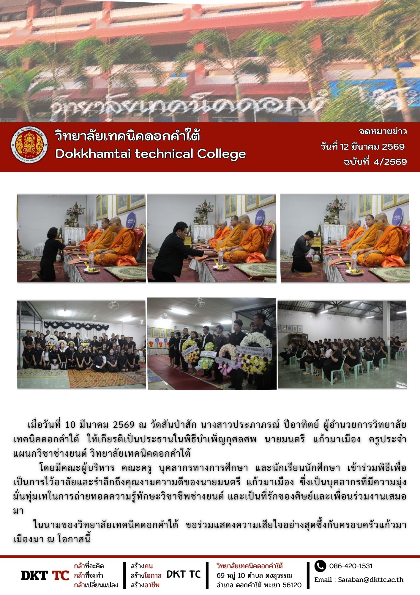 (10 มี.ค. 69) นางสาวประภาภรณ์ ปีอาทิตย์ ผู้อำนวยการวิทยาลัยเทคนิคดอกคำใต้ เป็นประธานในพิธีบำเพ็ญกุศลศพ นายมนตรี แก้วมาเมือง ครูแผนกวิชาช่างยนต์ ณ วัดสันป่าสัก