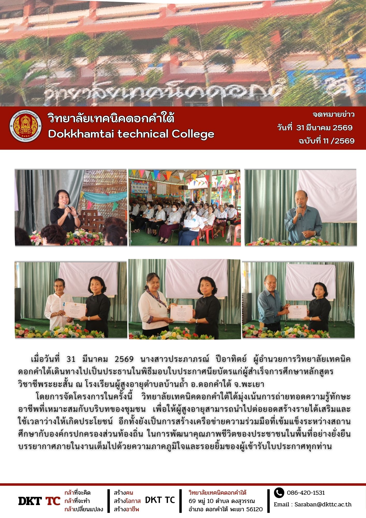 (31 มี.ค. 69) นางสาวประภาภรณ์ ปีอาทิตย์ ผู้อำนวยการวิทยาลัยเทคนิคดอกคำใต้ ลงพื้นที่ร่วมแสดงความยินดีและมอบใบประกาศนียบัตรให้กับคุณตาคุณยายที่สำเร็จการศึกษาหลักสูตรระยะสั้น ณ โรงเรียนผู้สูงอายุตำบลบ้านถ้ำ จ.พะเยา